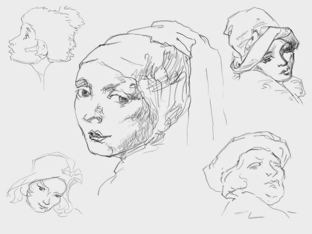 I've been busy practicing and working. Here's a snapshot of some of my latest training: bargue copies. I use them slightly different than what I used to do at the atelier: I measure everything strictly by sight and all of these are done digitally using the Photoshop pencil live brush.
